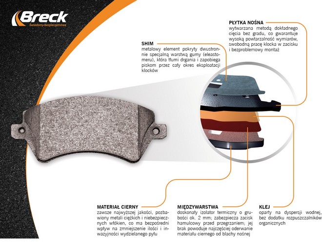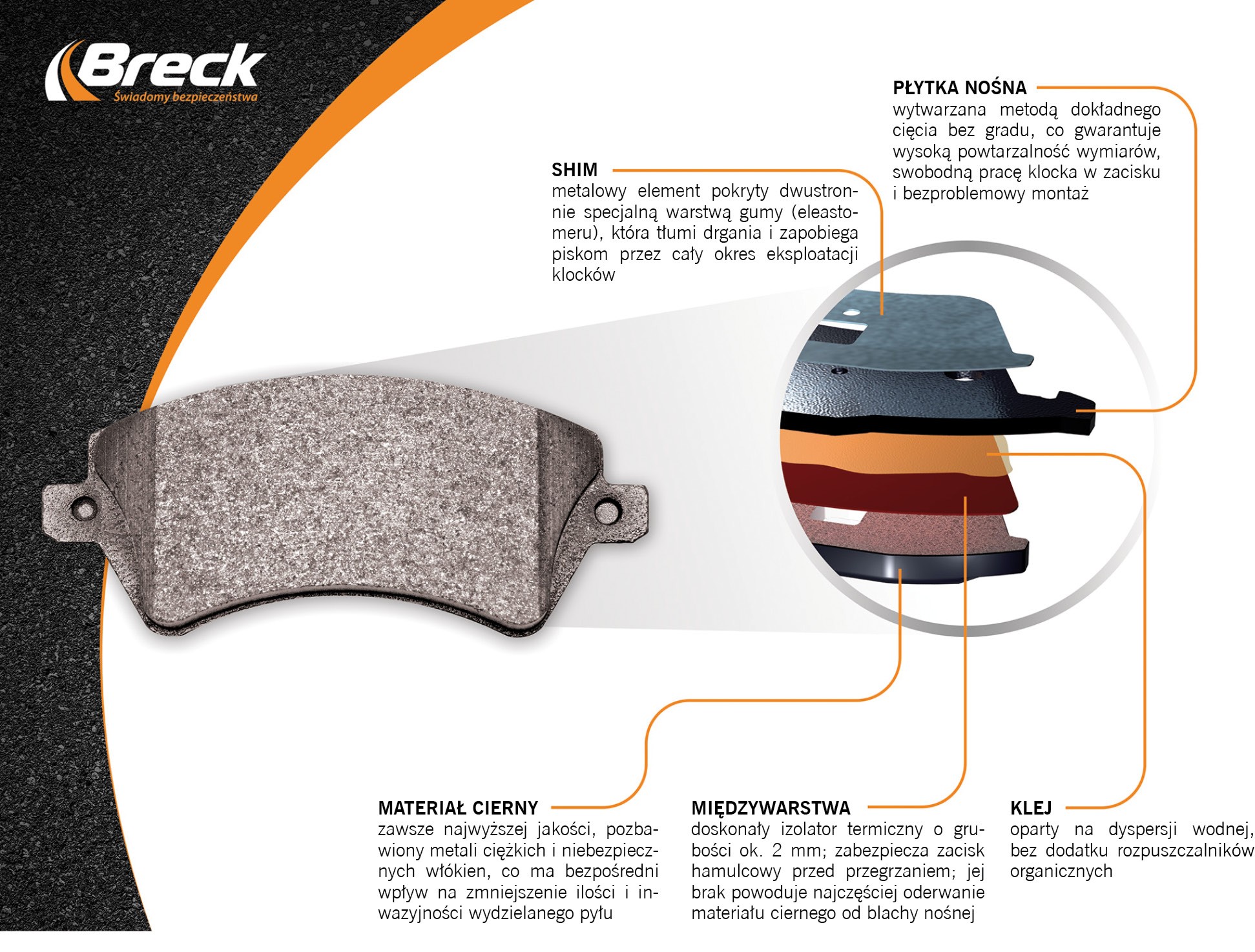Płytka nośna – wytwarzana metodą dokładnego cięcia, (tzw. fine banking), co zapewnia wysoką powtarzalność wymiarów, swobodną pracę klocka w zacisku i bezproblemowy montaż. Stosowanie tej metody jest ważnym atutem marki Breck, gdyż większość producentów stosuje cięcie mechaniczne, mogące powodować zatarcie klocka w zacisku i ciągłe jego ocieranie o tarczę, a w efekcie – uszkodzenie obu tych części.