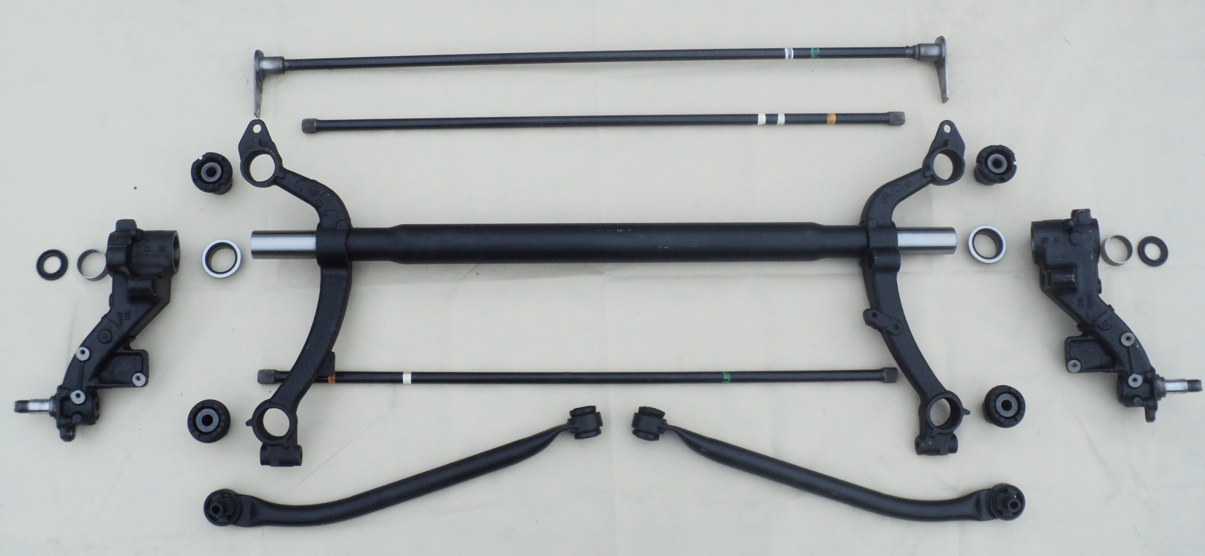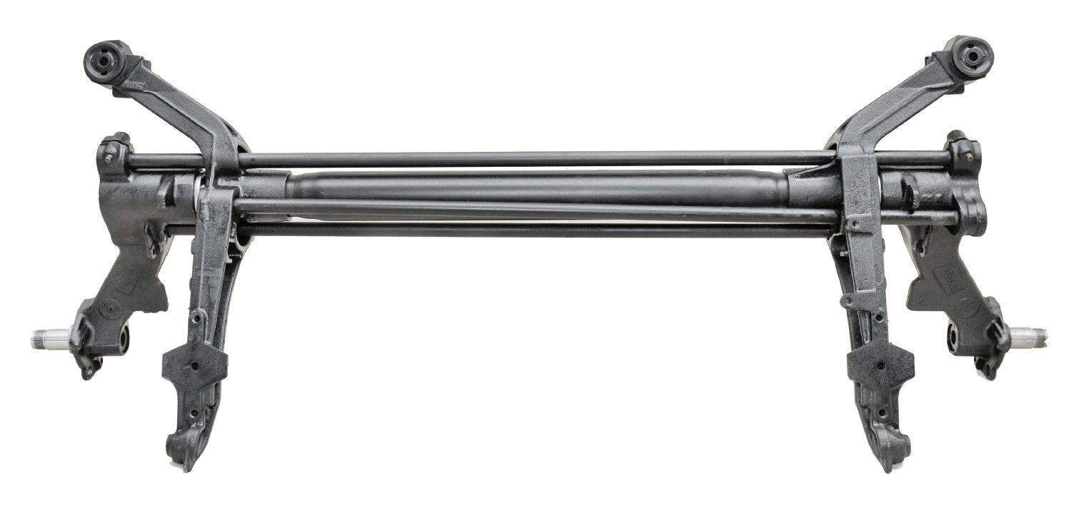 Schemat elementów belki zespolonej, od góry: drążek stabilizatora, skrętne drążki resorujące z zamocowaniami, wsporniki rury nośnej, rura nośna, wymienne czopy łożyskowania wahaczy, łożyska, wahacze, czopy piast tylnych kół, dodatkowe drążki reakcyjne
