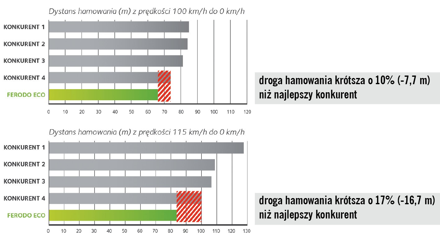 Ich przewagę nad tradycyjnymi produktami miedziowymi potwierdzają najnowsze testy. Na przykład, droga hamowania popularnego Volkswagena Golfa Mk6 z prędkości 100 km/h skróciła się o 10%, a przy próbie hamowania ze 115 km/h o 17%. Z kolei droga hamowania Peugeota Boxera i Fiata Ducato z prędkości 100 km/h oraz 115 km/h była krótsza odpowiednio o 12 lub 16 metrów. Testy hamowania aut dostawczych zostały przeprowadzone przez niezależną firmę badawczą Mira Ltd z Wielkiej Brytanii i dotyczą porównania klocków Ferodo z drugą, konkurencyjną marką o najlepszych wynikach.