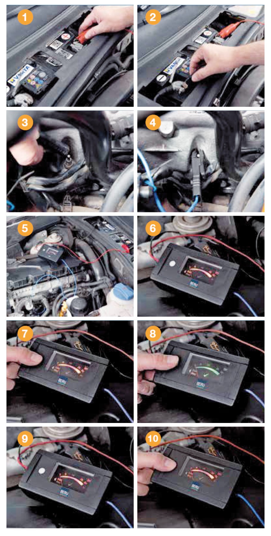 Na początku łączy się odpowiednio kabel dodatni (czerwony) i ujemny (czarny) do akumulatora (fot.1, 2). Dobre i bezpieczne podpięcie kabli zasilających pozwoli uniknąć błędnych wskazań. Na testerze pojawi się czerwone światło. Następnie wyciąga się gniazdo zasilania świecy (fot. 3) i podpina do niej kabel niebieski (fot. 4, 5). Jeżeli dostęp do gniazda świecy jest utrudniony, niebieski kabel testowy może być również połączony za pomocą dodatkowego złącza wtykowego.