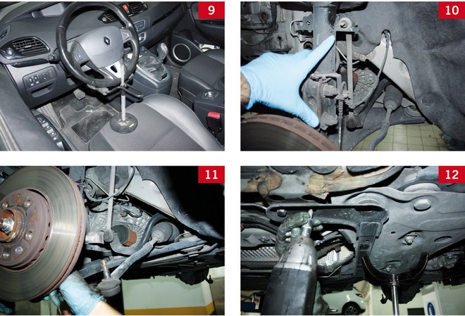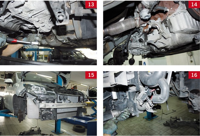 Przed podniesieniem pojazdu należy zablokować koło kierownicy w celu zdemontowania ramy pomocniczej (sanek) wraz z przekładnią kierowniczą (fot. 9). Dalsze czynności prowadzi się przy podniesionym samochodzie z odkręconymi kołami. Obejmują one demontaż lewego nadkola, łącznika stabilizatora, końcówki drążka kierowniczego i sworznia wahacza. Ramę pomocniczą (sanki) zabezpiecza się wspornikiem hydraulicznym i odkręca się śruby ją mocujące (fot. 10, 11, 12). Po stronie skrzyni biegów trzeba odłączyć wiązkę przewodów, zdemontować rurę do intercoolera i górną śrubę mocującą wiązkę silnika na skrzyni biegów, odłączyć wtyczkę sterownika skrzyni biegów, zdjąć wiązkę silnika ze skrzyni biegów, wymontować rozrusznik i spuścić olej ze skrzyni (fot. 13).