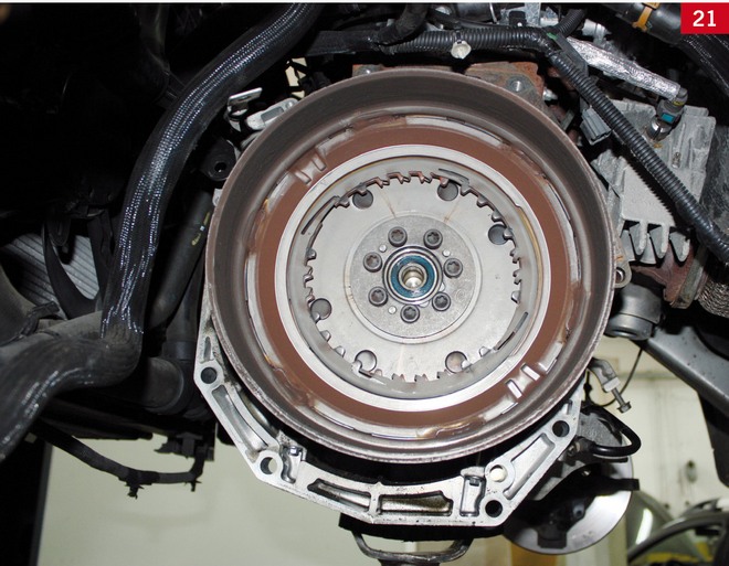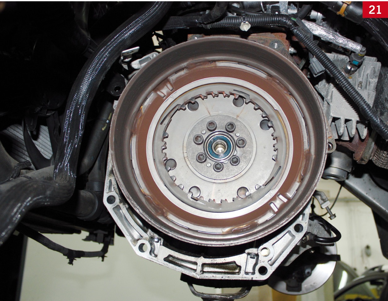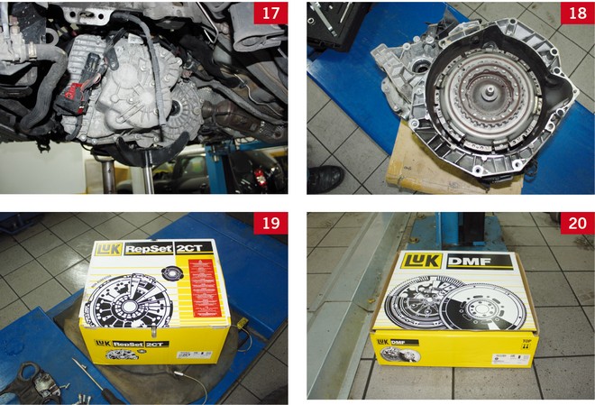 W następnej kolejności należy zdemontować (fot. 14, 15, 16): lewą i prawą półoś (zwracając uwagę na pośrednie łożysko podpierające), a także przedni zderzak, belkę podpierającą chłodnicę, ramę pomocniczą podsilnikową (sanki). Potem można odkręcić śruby i wymontować skrzynię biegów. Trzeba przy tym pamiętać o jej znacznej masie, charakterystycznej dla wersji dwusprzęgłowej, w której sprzęgło jest zamontowane wewnątrz skrzyni (fot. 17 i 18). Montaż skrzyni z silnikiem przebiega w odwrotnej kolejności. Należy zawsze zweryfikować stan i pozycję kołeczków centrujących. Ze względu na ryzyko uszkodzenia wieloklinu tarczy śruby mocujące skrzynię powinno się dokręcić z właściwym momentem zgodnie z zaleceniami producenta pojazdu.