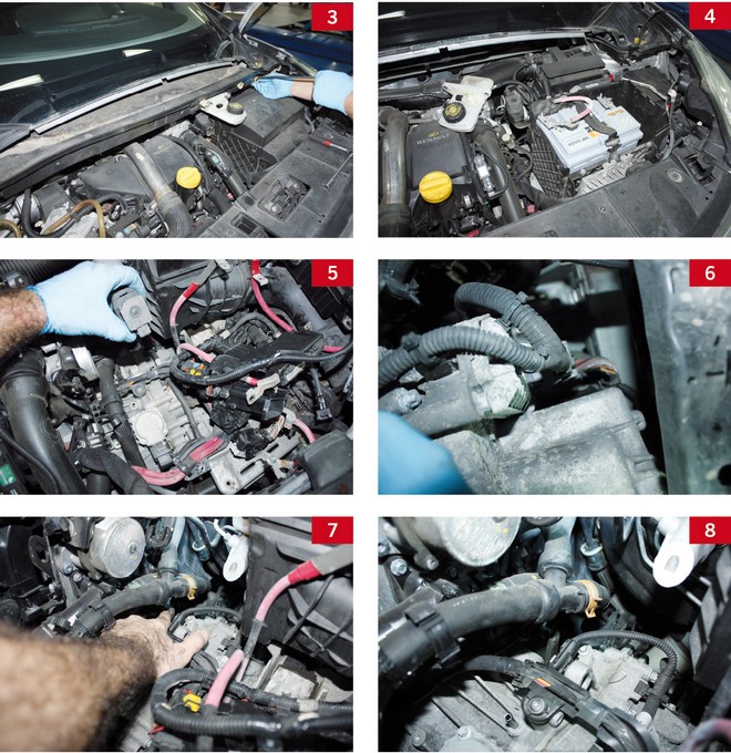 W pierwszej kolejności należy (fot. 3, 4 i 5): odłączyć i wymontować akumulator oraz jego podstawę, zdemontować środkową część atrapy chłodnicy, środkową część rury pod atrapą doprowadzającej powietrze do filtra i obudowę filtra powietrza. Następnie (fot. 6, 7 i 8) odłącza się: przewód kontrolny elektrozaworu sterującego turbosprężarką, wiązkę z elektrozaworu turbosprężarki, wiązkę akumulatora (zdejmując ją z lewego mocowania zawieszenia). Trzeba też odpiąć i zabezpieczyć przed uszkodzeniem cięgno wyboru biegów.
