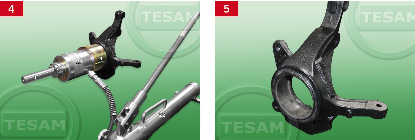 Jeśli wymienione ma być również łożysko, a taki przeważnie jest główny cel naprawy, wyjmuje się ustalający je w gnieździe obwodowy pierścień sprężysty, by później ponownie skorzystać z prasy. Tym razem powinna być ona uzbrojona w tuleję oporową dostosowaną zewnętrznie do średnicy gniazda, w której otworze zmieści się swobodnie wyciągane łożysko. Na końcu trzpienia ciągnącego musi być wówczas zamontowana końcówka robocza, naciskająca na zewnętrzny pierścień łożyska (fot. 4). Stopniowe zwiększanie ciśnienia płynu hydraulicznego za pomocą ręcznej pompy powinno doprowadzić do całkowitego wysunięcia łożyska z gniazda wraz z zamykającym je zewnętrznym pierścieniem uszczelniajacym (fot. 5).