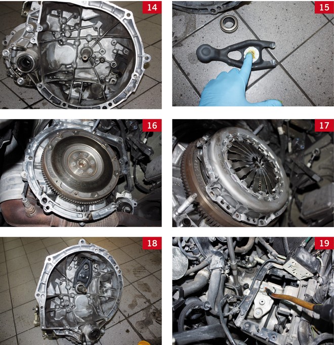 Wymontowaną skrzynię należy wyczyścić i wymontować z niej w celu wymiany widełki wysprzęglające z uwagi na ich znaczne zużycie, charakterystyczne dla tego modelu. Nowe widełki przed zamontowaniem trzeba nasmarować w obu miejscach ich kontaktu z łożyskiem wysprzęglającym (fot. 14, 15).