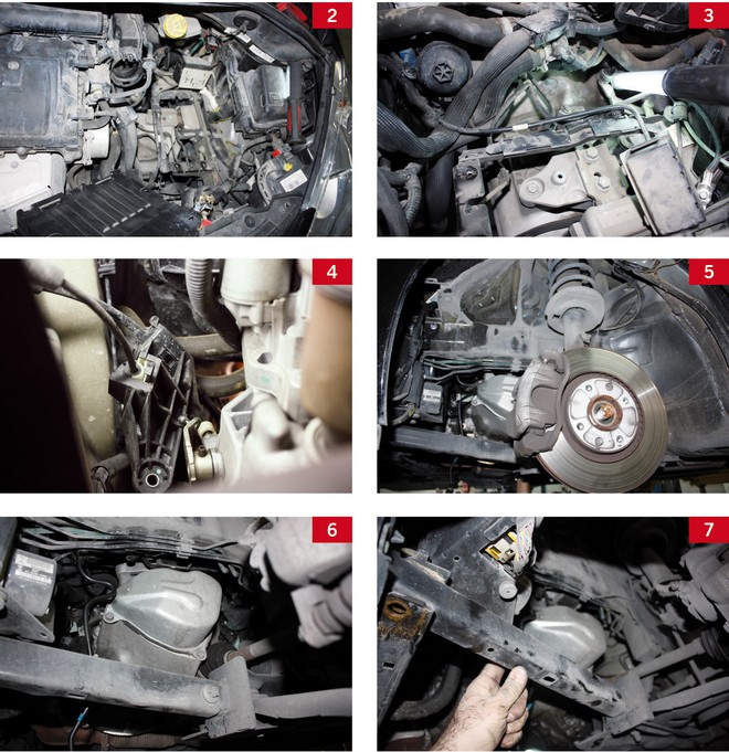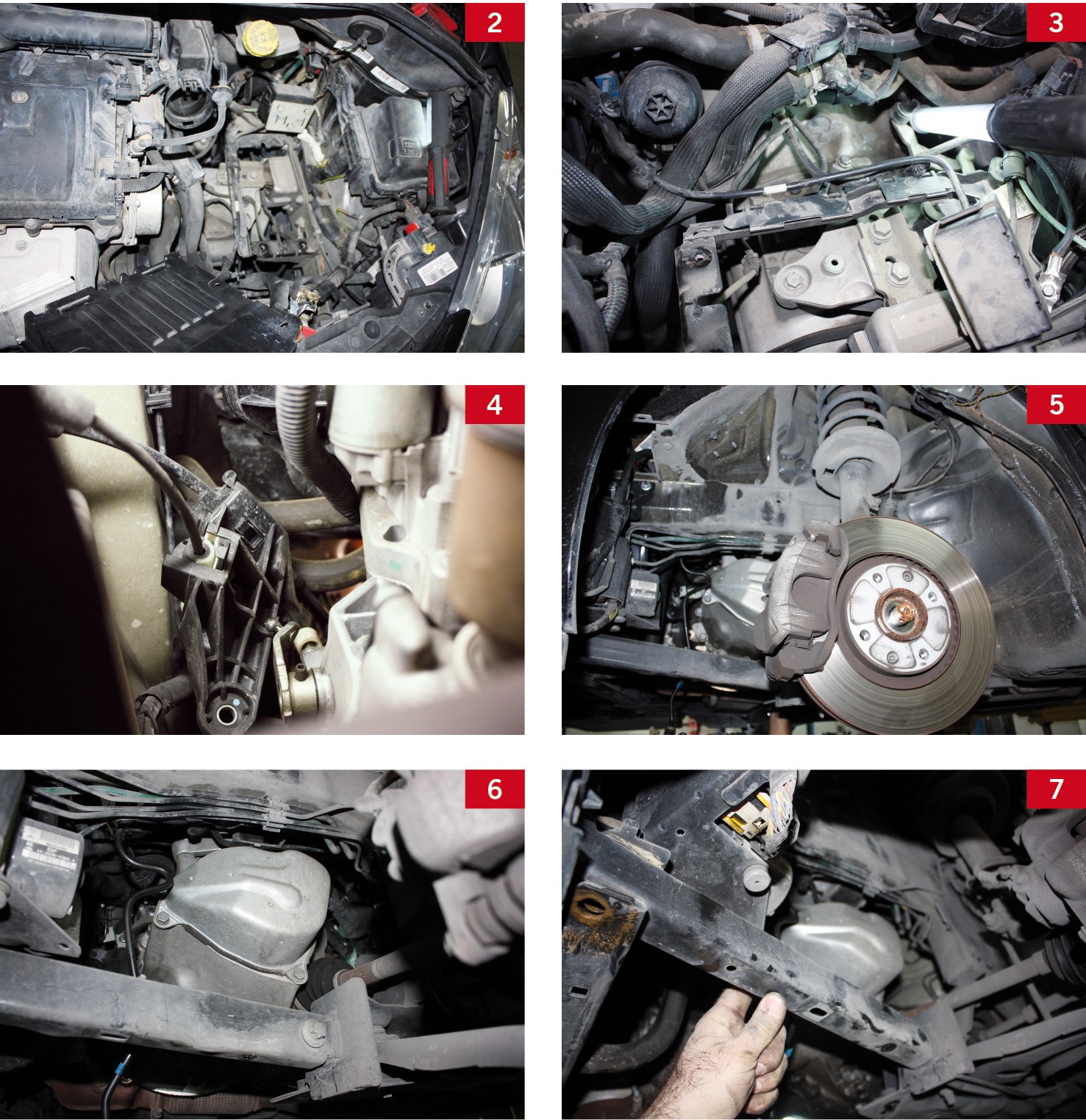 W komorze silnika należy odłączyć i wymontować akumulator oraz jego podstawę, odkręcając dwie śruby (klucz "10"), a następnie odłączyć skrzynkę bezpieczników. Potem trzeba zdemontować obudowę filtra powietrza i rurę zasysającą, a w dalszej kolejności odłączyć przewód "masy" ze skrzyni biegów (klucz "13"). Ze skrzyni biegów należy też odkręcić i odsunąć na bok wiązkę przewodów oraz odłączyć cięgna zmiany biegów zamocowane dwiema śrubami na plastikowej podstawie. Jedna śruba jest odkręcana od góry, a druga – od dołu (fot. 2, 3 ,4).