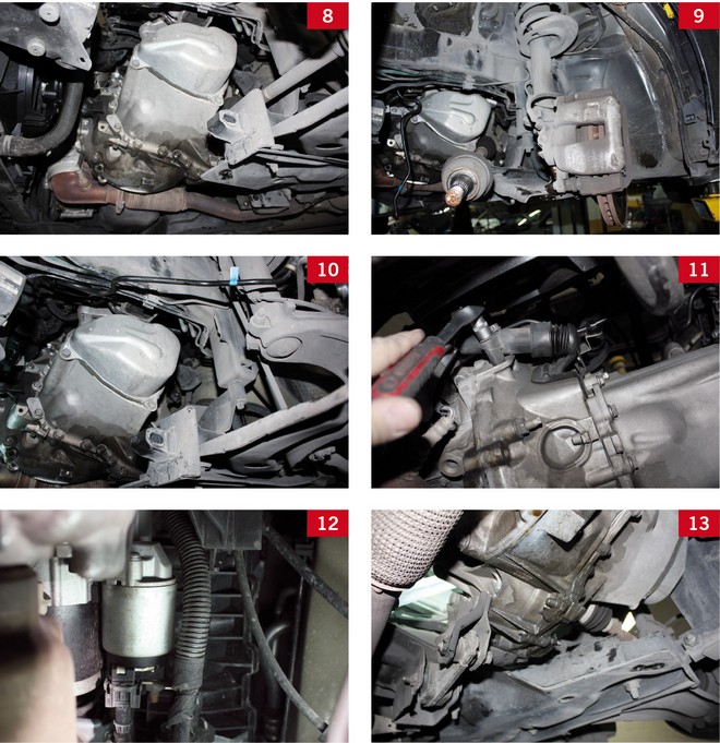 W dalszej kolejności odkręca się rozrusznik (trzy długie śruby z łbami imbusowymi), a następnie pozostałe śruby mocujące skrzynię biegów oraz mocowanie poduszki skrzyni (fot. 12 i 13). Uwolnioną skrzynię opuszcza się w dół.