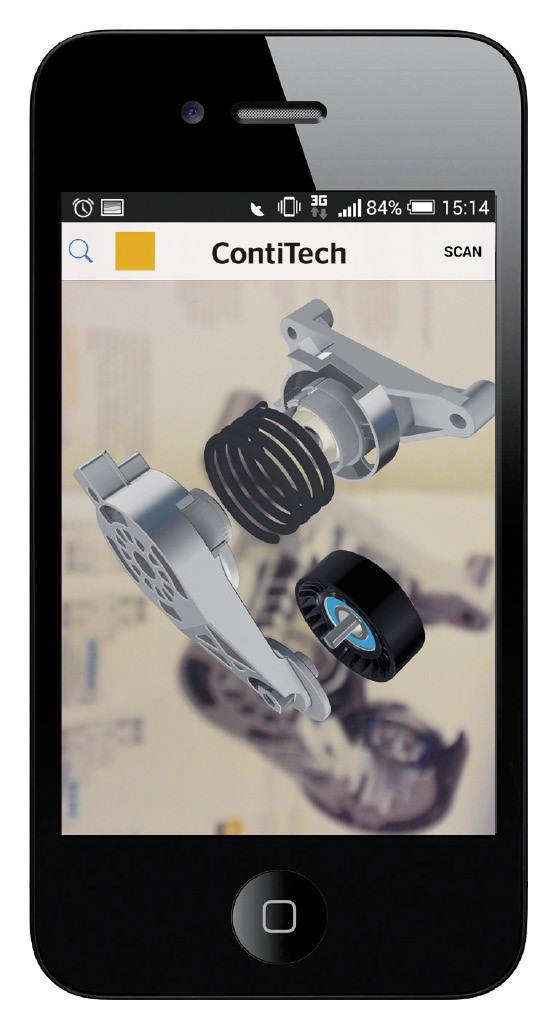 Aplikacja oferuje także tzw. "rozszerzoną rzeczywistość" (Augmented Reality – AR). Dzięki niej, po zeskanowaniu charakterystycznego logo (rys. 4) znajdującego się w materiałach informacyjnych ContiTech, można zobaczyć np. modele trójwymiarowe (3D) napinaczy (rys. 5) lub innych elementów napędów pasowych, pasków, a także animację sposobu działania czterosuwowych silników spalinowych. Szczegółowe rysunki można obracać i przesuwać.