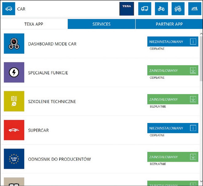 Według konstruktorów firmy Texa, tester diagnostyczny to nie tylko urządzenie umożliwiające odczyt błędów, parametrów pracy, czy też wykonanie aktywacji i zaawansowanych procedur kodowania lub kalibracji, lecz również skarbnica danych technicznych, dzięki którym mechanik uzyskuje wiedzę na temat diagnozowanego układu. W tym celu, oprócz standardowego pakietu danych technicznych, użytkownik może korzystać z unikatowego sklepu APP, udostępniającego opcjonalnie dodatkowe aplikacje, takie jak: karty podzespołów, wartości nominalne oraz inne opracowania ułatwiające zrozumienie uzyskiwanych wartości diagnostycznych.
