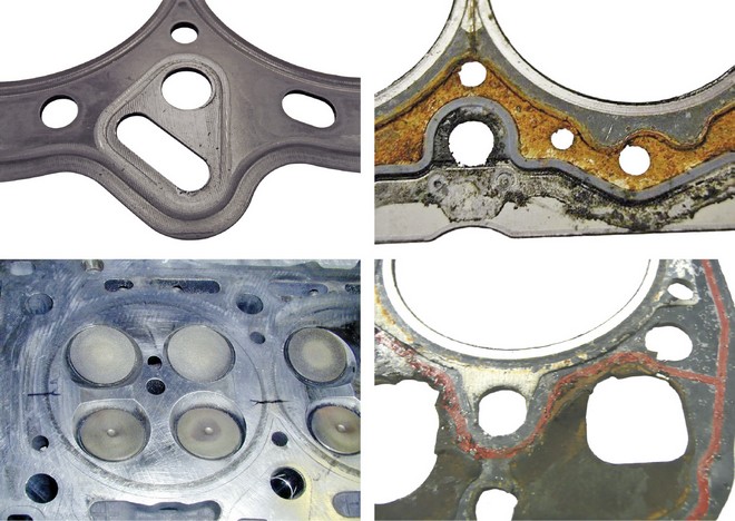 Nieszczelności na styku głowicy z kadłubem silnika mogą być powodowane niedokładnym oszlifowaniem powierzchni (dwa z lewej) albo agresywnymi składnikami płynu chłodzącego (dwa z prawej)