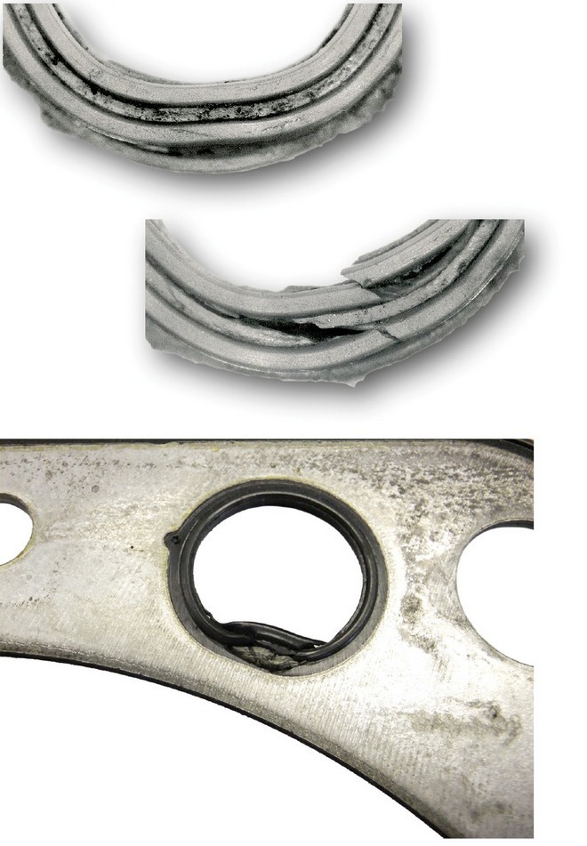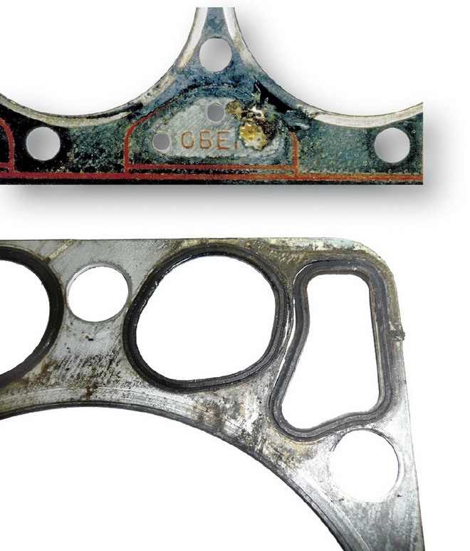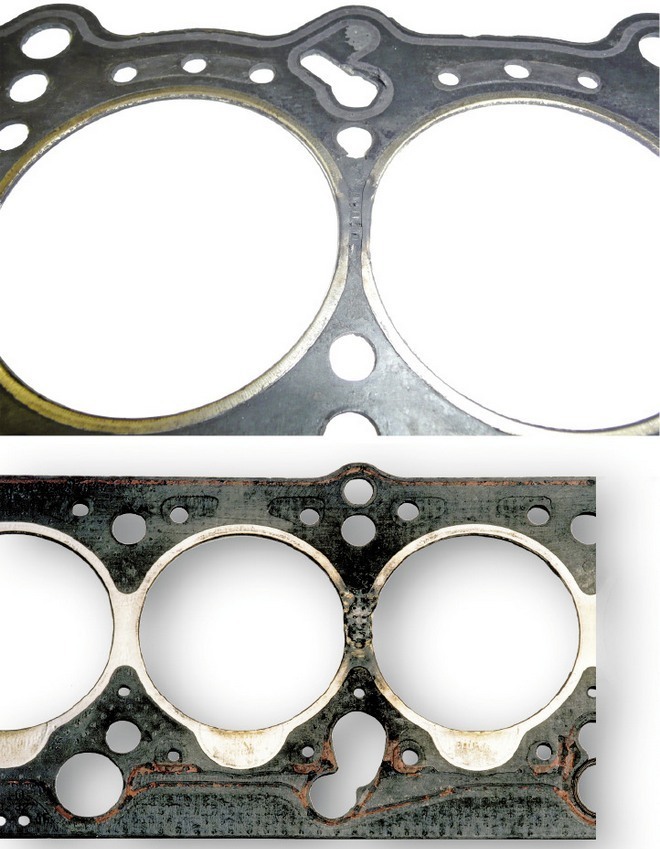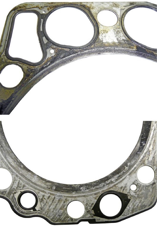 Ślady wydostawania się oleju lub czynnika chłodzącego poza ich obiegowe kanały są widoczne dopiero po zdjęciu głowicy. Ich przyczyną jest najczęściej wadliwy montaż uszczelki, na przykład jej niedokładne ustawienie (poprzeczne przesunięcie) z powodu braku kołków ustalających albo przypadkowe uszkodzenie elastomerowych elementów uszczelniających. Istotne znaczenie ma też poprzedzenie montażu dokładnym oczyszczeniem płaszczyzn przylgowych cylindrów i głowicy. Decydujący wpływ na skuteczność uszczelnienia ma równość i gładkość tych powierzchni. Szczególne znaczenie mają tu strefy pomiędzy krawędziami poszczególnych kanałów.