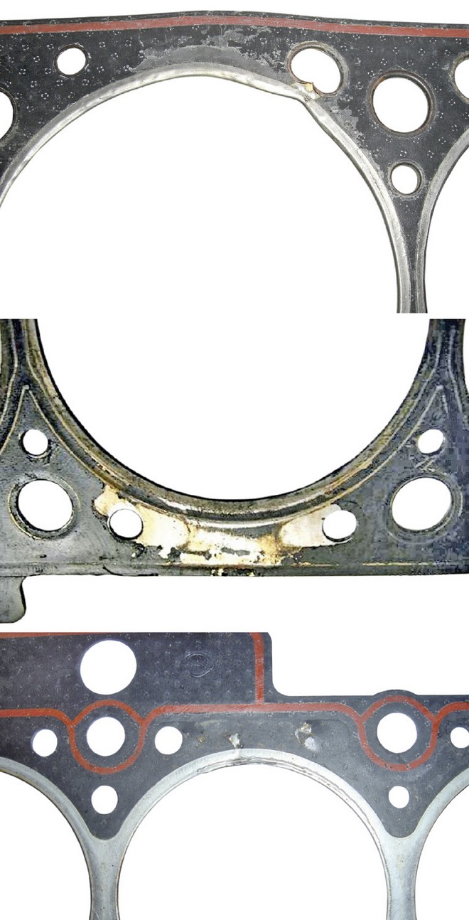 W uszczelkach wykonanych z metalu i materiału miękkiego przegrzanie prowadzi zazwyczaj do wyraźnego pęcznienia drugiej z tych substancji, zwłaszcza w pobliżu kanałów obiegu chłodziwa. Części metalowe ulegają wtedy przyspieszonej korozji.