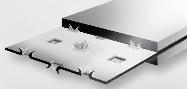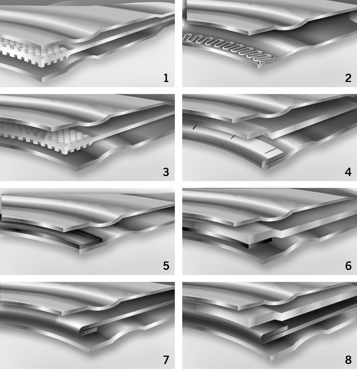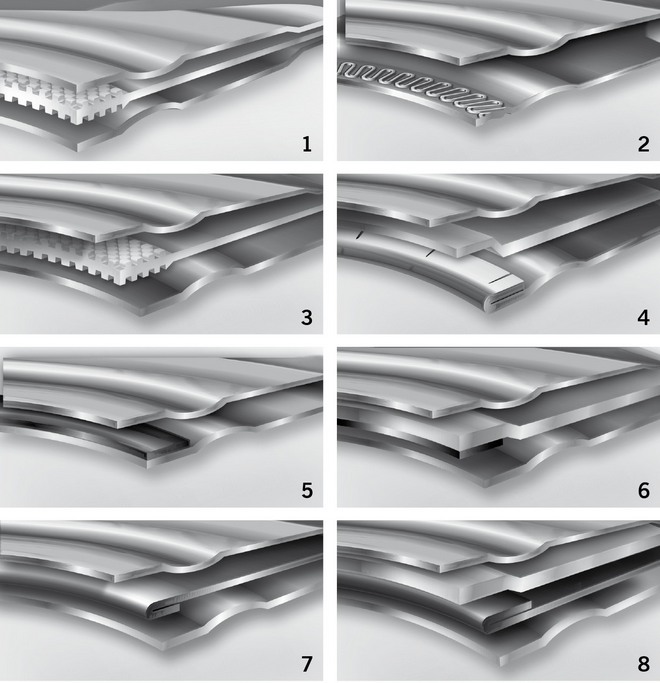 Warstwowa struktura uszczelki Metaloflex (1); stopery tłoczone: meandrowe (2), typu karo (3) i segmentowe (4); stopery zgrzewane laserowo: bez blachy nośnej (5), z blachą nośną (6); stopery falcowane: bez blachy nośnej (7), z blachą nośną (8)