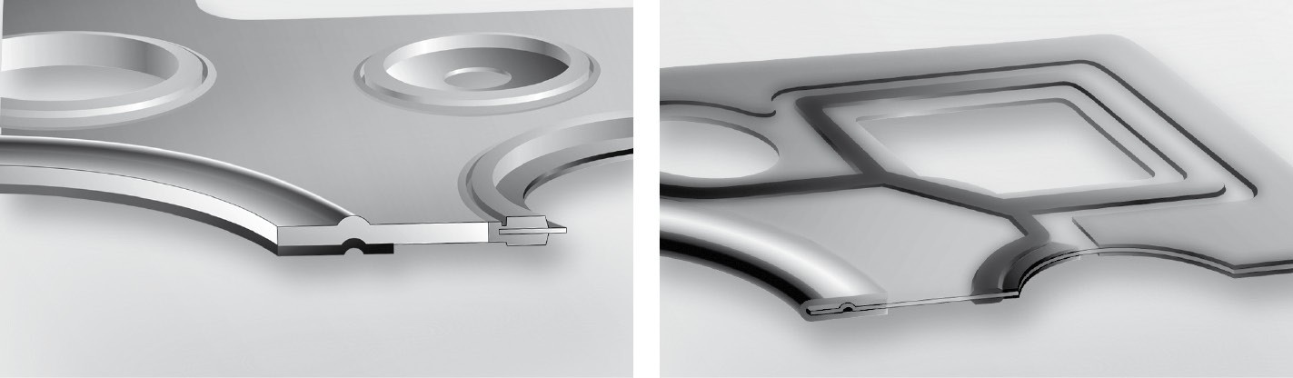 W tej konstrukcji nacisk uszczelnienia wokół komór spalania jest wysoki, natomiast niski przy kanałach obiegów cieczy, których połączenia uszczelniane są przez elastomerowe uszczelki wargowe. Warstwę nośną stanowi blacha ze stali szlachetnej lub chronionej odpowiednią powłoką antykorozyjną. Wykonane w niej otwory komór spalania otoczone są wytłoczonymi rowkami zapewniającymi równomierność, elastyczność i szczelność docisku.