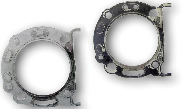 Uszkodzona przedmuchami uszczelka motocyklowa o dwuwarstwowej konstrukcji metalowej