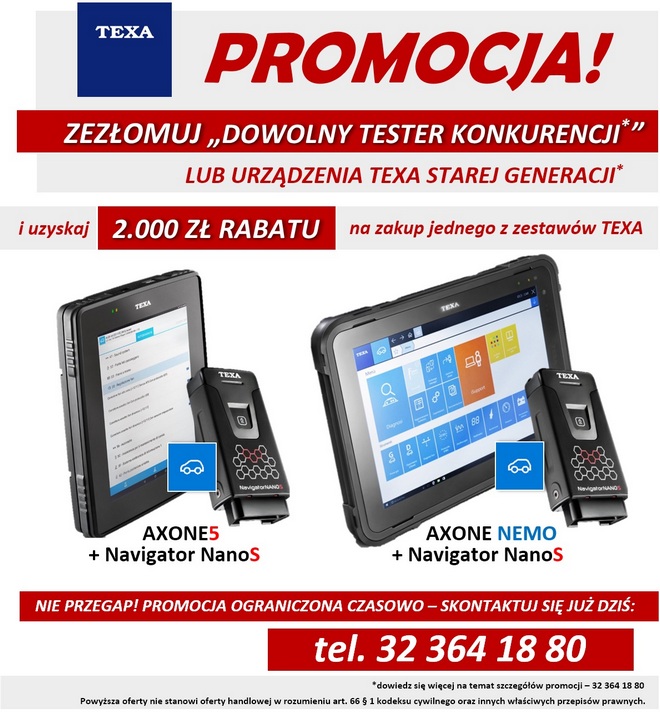 W czasie trwania akcji warsztatom proponowane jest złomowanie starych urządzeń diagnostycznych dowolnego producenta i nabycie w zamian testera marki Texa z rabatem sięgającym 2000 złotych.
