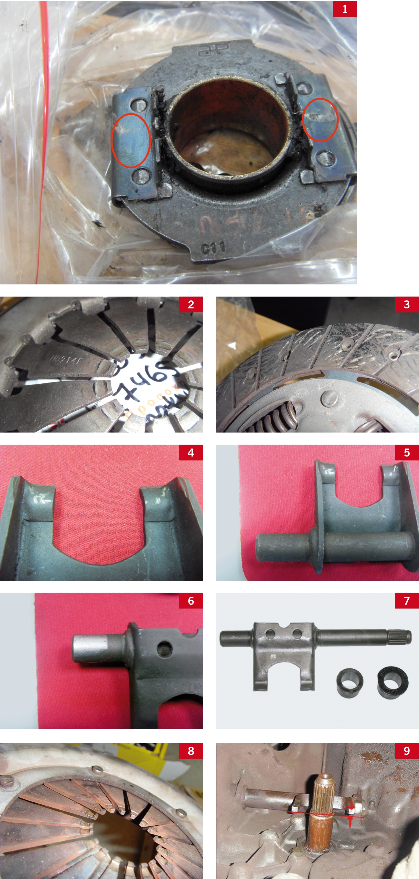 Na fot. 7 widać wszystkie podzespoły, które należy wymienić razem z widełkami. Ich całkowicie współśrodkowy ruch zapewniają dwie plastikowe tulejki, które należy zawsze wymieniać przy każdej naprawie sprzęgła.