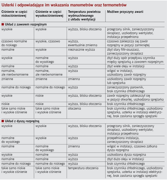 Przedstawione w zamieszczonej obok tabeli wskazówki nie wyczerpują wszystkich możliwości. Należy zawsze pamiętać o odpowiedniej temperaturze otoczenia – w ekstremalnie zimne lub gorące dni wskazania manometrów mogą różnić się od przyjętych wartości pomimo sprawnej pracy układu.