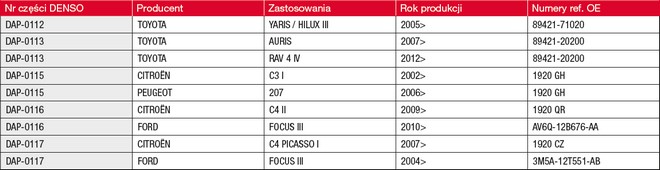 Nowe czujniki Denso mają zastosowanie głównie w pojazdach marek Honda, Subaru i Toyota (szczegóły w tabeli).