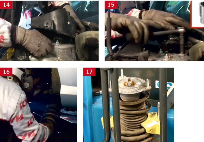 Najpierw umieścić nowy amortyzator KYB, sprężynę zawieszenia, zestaw montażowy górnego mocowania oraz zestaw osłonowo-ochronny w kolumnowym ściskaczu hydraulicznym z bramką zabezpieczającą i zmontować całą kolumnę.