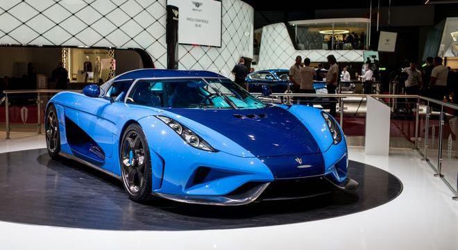 Koenigsegg Regara w błękicie podczas salonu samochodowego w Genewie w 2018 r. Pojazd lakierowała firma Moses Bil & Lack w szwedzkim Sätaröd