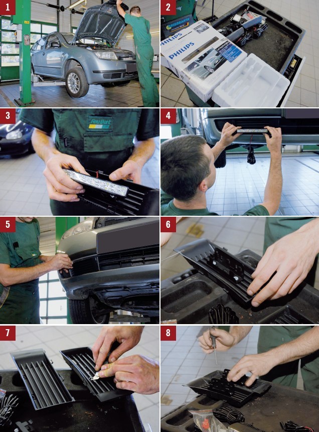 Zainstalowanie tych diodowych świateł do jazdy dziennej w warsztacie lub serwisie samochodowym jest, dzięki szczegółowej instrukcji dołączanej do każdego kompletu montażowego, bardzo proste i nie wymaga użycia żadnych narzędzi spoza ich standardowego, warsztatowego zestawu. Pracę tę można wykonać w dowolnym miejscu, ale dla wygody mechanika najlepiej jest podnieść samochód na odpowiednią wysokość podnośnikiem hydraulicznym (fot.1 - zdjęcia i instruktaż filmowy znajdują się na końcu artykułu). Zestaw montażowy należy wyjąć z opakowania i po zapoznaniu się z instrukcją skompletować wszystkie potrzebne narzędzia (fot.2).