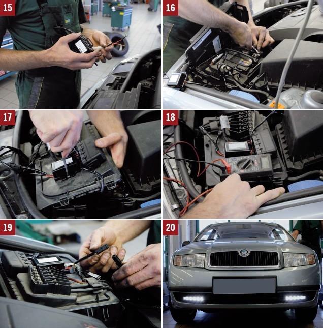 Za pomocą multimetru lub próbnika neonowego odnajduje się przewody zasilające światła pozycyjne i światła mijania, by połączyć z nimi odpowiednie kable modułu sterującego (fot.18). Ostatnią czynnością jest elektryczne połączenie tego modułu ze światłami do jazdy dziennej (fot.19) i sprawdzenie prawidłowości ich działania (fot.20).