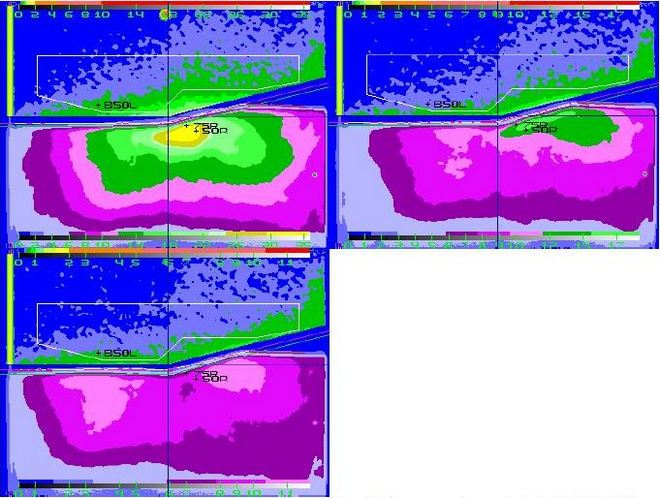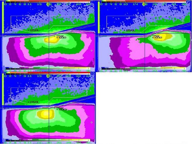 Kolejny przebadany produkt, marki „B”, uzyskał wartość natężenia oświetlenia w punkcie Emax na wysokim poziomie (102% oraz 109%), natomiast ze względu na brak precyzji w położeniu żarnika, źródło to uzyskało bardzo niskie wartości natężenia oświetlenia w punktach 50R oraz 75R, które są kluczowe z punktu widzenia bezpieczeństwa. Obszar maksymalnego natężenia oświetlenia żarówek badanych jest przesunięty w stosunku do wzorca w jednym przypadku w kierunku pobocza drogi, zaś w drugim w kierunku pasa środkowego jezdni. Zamontowanie dwóch źródeł światła o tak różnych parametrach świetlnych powoduje nieodpowiednie oświetlenie drogi przed pojazdem i może być powodem niezauważenia przeszkody podczas jazdy (Rys. 2).