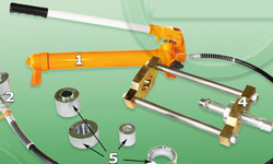 Główne części takiego zestawu (rys. 10) to ręczna pompa połączona elastycznym przewodem ciśnieniowym z siłownikiem hydraulicznym o osiowym działaniu rozpierającym. Uzupełnienie stanowi ramowa konstrukcja reakcyjna (tzw. ramiak) z gwintowanym trzpieniem oporowym oraz komplet potrzebnych adapterów.