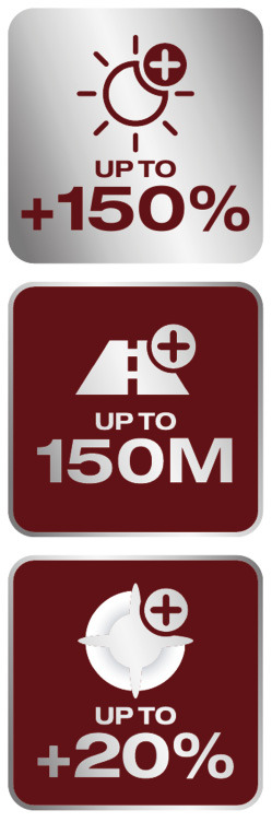 Informacje o wzmocnionych parametrach żarówki, od góry: jasność światła, zasięg reflektora i bielsze światło |