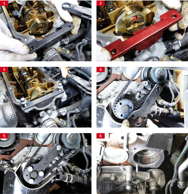W pierwszej kolejności demontuje się pokrywę silnika, w następnej – osłonę dolną, potem prawe przednie koło wraz z nadkolem, a na koniec – prawą podporę mocującą ramę belki wspierającej. Wymontowania wymaga również wąż doprowadzający powietrze do filtra powietrza oraz sama obudowa filtra. Kolejnymi czynnościami są: zdjęcie paska wielorowkowego, demontaż koła pasowego wału korbowego oraz pokrywy zaworów. Następnie, korzystając z narzędzi 1 – 4, podpiera się silnik podnośnikiem, demontuje jego mocowanie, usuwa górną i dolną osłonę rozrządu oraz za pomocą przyrządu OE 1871001300 tymczasowo blokuje w uniesionej pozycji.