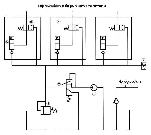 Schemat systemu ACL 1. pompa oleju 2. zawór trójpozycyjny 3. zawór bezpieczeństwa 4. dozownik indywidualny 5. pompka dozująca 6. zawór dwupozycyjny 7. czujnik ciśnienia