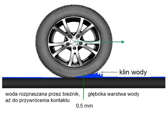 Utrata kontaktu opony z jezdnią podczas jazdy po mokrej nawierzchni z powodu ich rozdzielnia warstewką wody. Ryzyko a. wzrasta po przekroczeniu prędkości granicznej i przy zbyt płytkiej rzeźbie bieżnika.