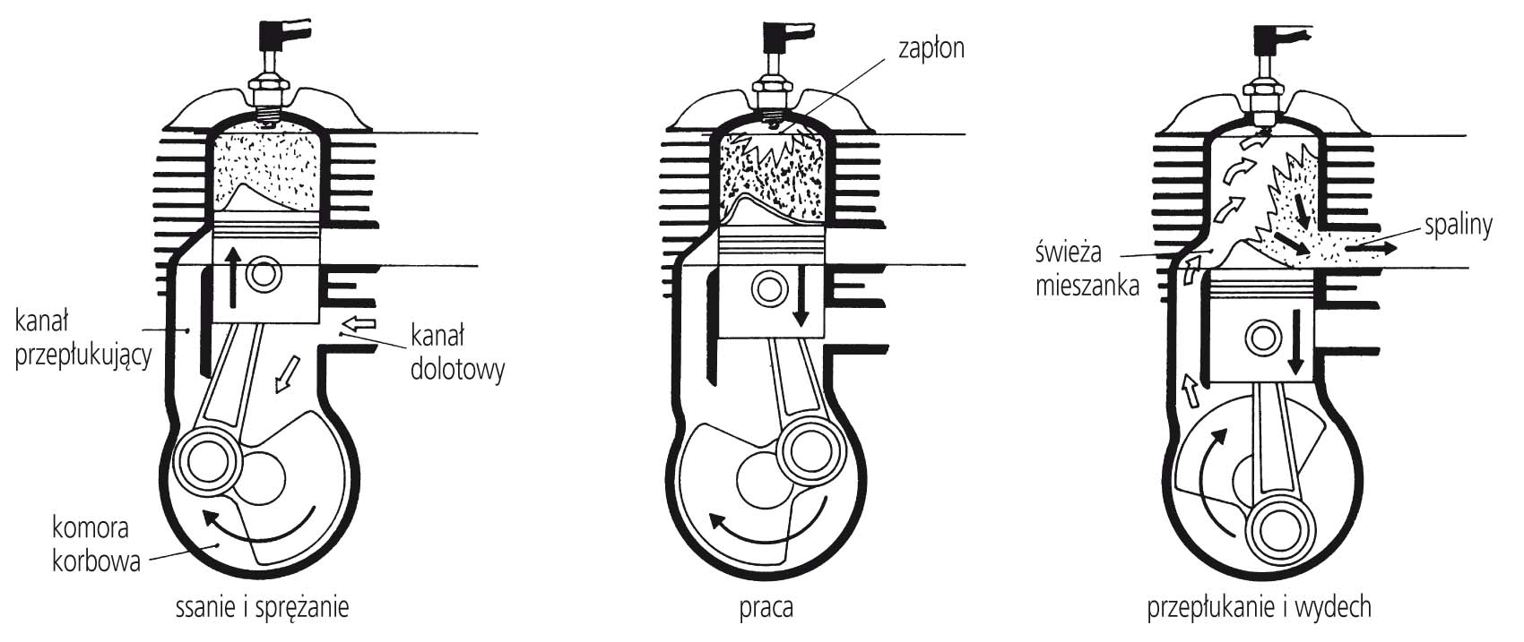 Konstrukcja tłokowego silnika spalinowego, w której jeden suw roboczy w cylindrze (rozprężenie zapalonej mieszanki) przypada na jeden obrót wału korbowego. Podczas drugiego suwu odbywa się sprężanie mieszanki i (w niektórych rozwiązaniach) napełnianie nią hermetycznej skrzyni korbowej. Przy dolnym martwym położeniu tłoka następuje przepłukanie cylindra, czyli wydech spalin i wprowadzenie świeżej mieszanki.