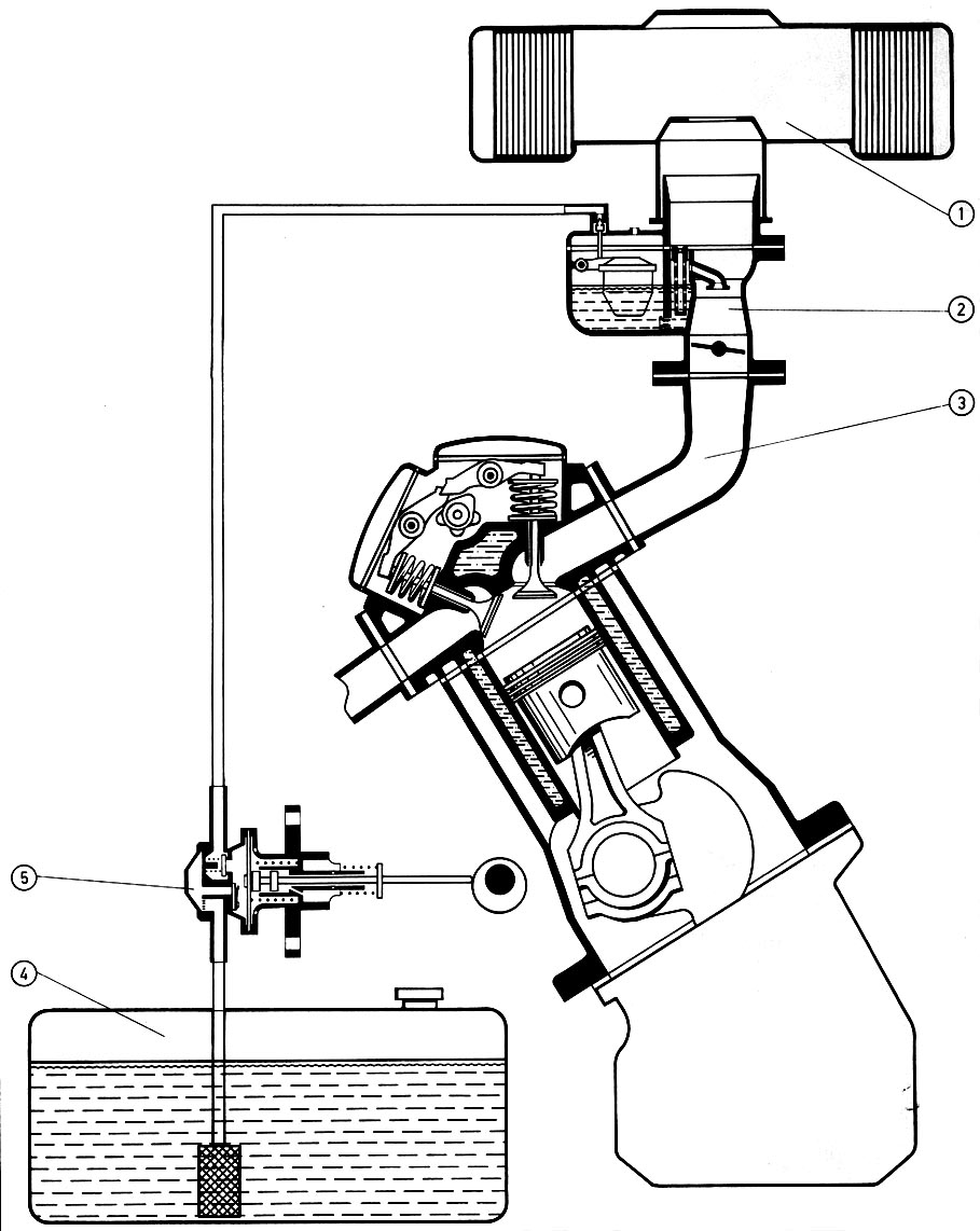 Gaźnikowe zasilanie silnika ZI: 1. filtr powietrza 2. gaźnik 3. rura ssąca 4. zbiornik paliwa 5. pompa paliwa