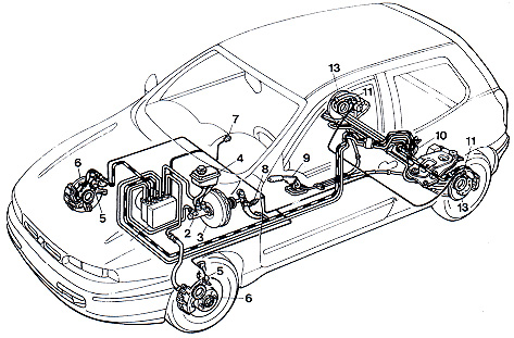 Nowoczesny układ hamulcowy w samochodzie osobowym: 1. Sterownik elektroniczny 2. Pompa hamulcowa 3. Serwo - urządzenie wspomagające 4. Zbiornik płynu hamulcowego 5. Czujnik ilości obrotów kół przednich 6. Przednie hamulce tarczowe 7. Lampka sygnalizacyjna awarii ABS 8. Wyłącznik światła stop 9. Dźwignia hamulca pomocniczego (postojowego) 10. Korektor hamowania 11. Czujnik prędkości obrotowej kół tylnych 12. Tylne hamulce tarczowe
