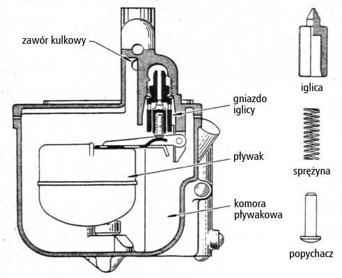 Układ utrzymujący stały poziom paliwa w gaźniku. Składa się z wahliwie lub przesuwnie zamocowanego pływaka, współpracującego z zaworem iglicowym.