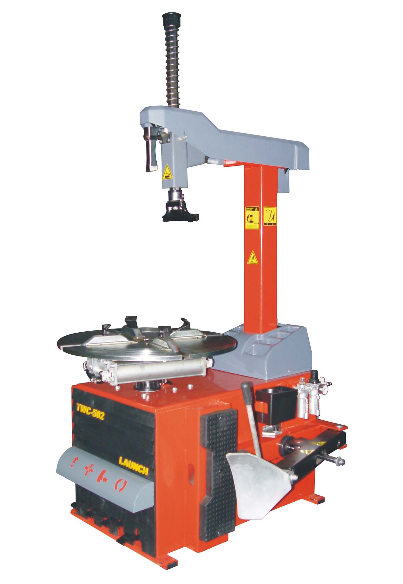 Elektropneumatyczne urządzenie do montażu i demontażu ogumionych kół samochodowych, wyposażone w: obrotowe wrzeciono z uchwytem do mocowania obsługiwanego koła, zbijak do odspajania opon od obręczy, łyżkę do przewijania obrzeża opony przez krawędź obręczy, rolkę do nasuwania opony na obręcz, inflator do szybkiego napełniania powietrzem opon bezdętkowych.