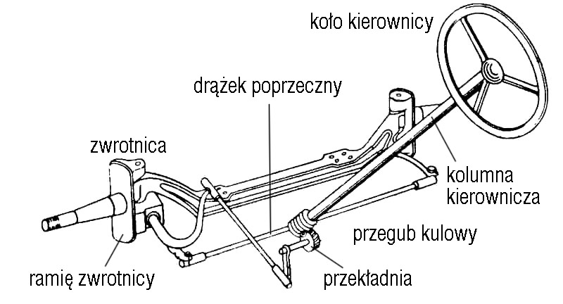 Tworzą go wszystkie urządzenia służące do utrzymywania lub zmiany kierunku ruchu pojazdu, czyli w przypadku samochodów zwrotnice kół kierowany, drążki pośrednie łączące je z przekładnią kierowniczą (najczęściej śrubową lub zębatkową), wał i koło kierownicy, a przeważnie też hydrauliczny, elektrohydrauliczny lub elektryczny system wspomagania (patrz » wspomaganie).