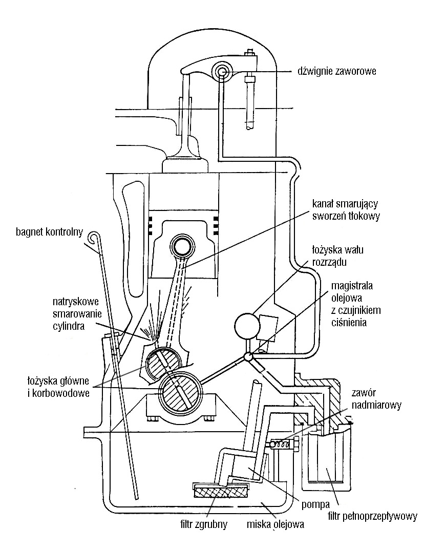 Niezbędny w silnikach czterosuwowych (patrz » silnik czterosuwowy) zespół urządzeń dostarczających płynny środek smarny o zwiększonym ciśnieniu z miski olejowej (patrz » miska olejowa) lub osobnego zbiornika przez pompę olejową (patrz » pompa olejowa), » filtr oleju i kanały rozprowadzające do wszystkich współpracujących ze sobą ruchomych części.