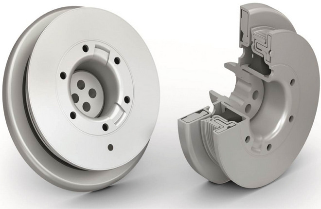 Drugim jest złożony, odsprzęglony tłumik drgań skrętnych (TVDC), składający się z dwóch elementów: wyważarki harmonicznej i izolatora drgań. Wyważarka harmoniczna pochłania wibracje w wale korbowym i jest standardowym rozwiązaniem TVD (bez rowków na pas). Izolator drgań pochłania i izoluje wibracje powstałe w pomocniczym napędzie pasowym. Element rozpraszający energię w trakcie pracy odkształca się i wygina, zamieniając ruch w ciepło.