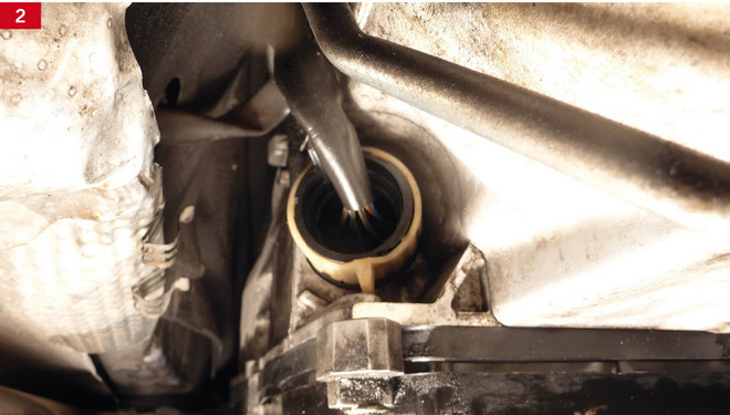 Zdemontować czerwony kołek blokujący na króćcu wlewu oleju skrzyni biegów, a następnie ściągnąć korek. Przez króciec wlewu, w którym umieszczony jest bagnet pomiarowy, nalać nieco mniejszą ilość oleju niż została wcześniej zlana. Do tego celu użyć czystego lejka lub rury wlewowej.