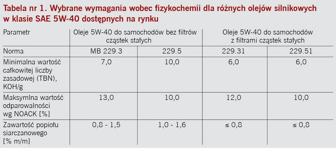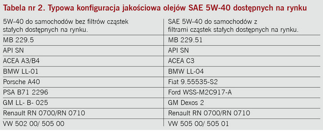 Kluczowe różnice w fizykochemii pomiędzy wymaganiami wymienionych norm MB przedstawiano w tabeli nr 1. Ze względu na niższą odparowalność oleje klas 229.5 i 229.51 należy uznać za bardziej zaawansowane technologicznie i trwalsze, co przenosi się na dłuższą zdolność do ochrony silnika w porównaniu, odpowiednio, z olejami klas 229.3 i 229.31. Porównując ceny olejów SAE 5W-40 dostępnych na rynku, warto zatem zwrócić uwagę, czy porównujemy oleje o tej samej czy różnych specyfikacjach MB. Poziomy jakości olejów SAE 5W-40 wg norm innych OEM korespondujące najczęściej z normami Mercedesa MB 229.5 i MB 229.51 przedstawiono w tabeli nr 2. Wynika z niej m.in., że dwa istotnie różne typy olejów są charakteryzowane tymi samymi normami wg API i Renault. Należy również dodać, że od kilku lat klasa jakości API CF posiada w klasyfikacji API status „nieaktywny” (obsolete). Nie ma zatem możliwości testowania nowych formulacji olejów na zgodność z jej wymaganiami, toteż w opisach wielu olejów w klasie SAE 5W-40 klasa ta nie jest obecnie deklarowana. Również, od kilku lat, Volkswagen dla nowych formulacji olejów przestał wydawać aprobaty na kombinację klas jakościowych: 502.00/505.00/505.01 – możliwe jest tylko pozyskanie aprobaty na kombinacje: 505 00/505.01 lub 502 00/505 00. Nie należy się zatem dziwić brakowi oznaczeń 502 00 na olejach SAE 5W-40 do samochodów z pompowtryskiwaczami.