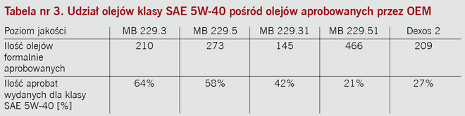 O wspomnianym na wstępie, słabnącym znaczeniu rynkowym olejów w klasie SAE 5W-40 świadczy zainteresowanie ich producentów pozyskiwaniem formalnych aprobat OEM. W tabeli nr 3 zestawiono ilość aktywnych aprobat Mercedesa na omawiane w niniejszej publikacji klasy jakościowe wraz z udziałem procentowym olejów w klasie SAE 5W-40 pośród nich.