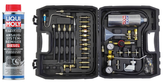Z lewej: płyn Liqui Moly do oczyszczania kolektora (art. nr 20986), z prawej: przenośne urządzenie Easy Clean w poręcznej walizce