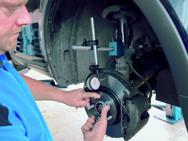 4. Należy sprawdzić bicie tarczy zamontowanej na piaście koła – standardowo nie powinna ona przekraczać 0,1 mm. Jeśli pojawia się problem, to trzeba również sprawdzić oscylację samej piasty (nie powinna być większa niż 0,02 mm).