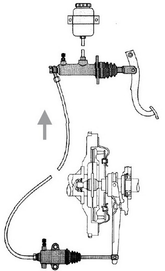 Sprzęgła odpowietrzamy, podając płyn hamulcowy pod ciś nieniem 0,4 bara w kierunku od wysprzęglika do pompy sprzęgłowej. Wymiana płynu przebiega jak w układach hamulca od zbiorniczka.