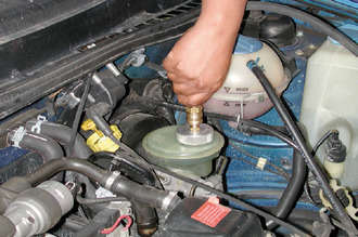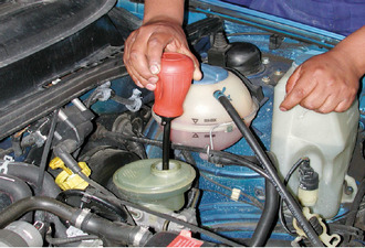 • eśli zbiorniczek jest zamocowany za pomocą zaczepów mocujących lub zawleczek do pompy hamulcowej, można zastosować ciśnienia 1–2,2 bary z zachowaniem ostrożności, by uniknąć rozłączenia zbiorniczka od pompy hamulcowej.