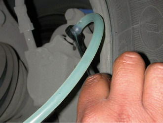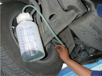 • popuszczając odpowietrznik, spowodować przepływ płynu hamulcowego podawanego pod ciśnieniem 0,4 bara ze zbiorniczka wyrównawczego w kierunku odpowietrznika zacisku hamulcowego.
