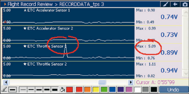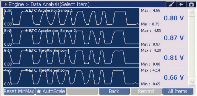 Po kilkukrotnym wciśnięciu pedału przyspieszenia sprawdzono występowanie ewentualnych spadków napięcia oraz różnic pomiędzy poleceniami czujnika pedału przyspieszenia a reakcją czujników położenia przepustnicy. Czujniki powinny pracować w zakresie napięcia pomiędzy 0,36 a 4,75 V. (rys. 1). Odczytanie niewłaściwego napięcia mogłoby świadczyć o możliwym przerwaniu obwodu lub o zwarciu. Na tym etapie diagnozy połączenia wyglądały na sprawne.